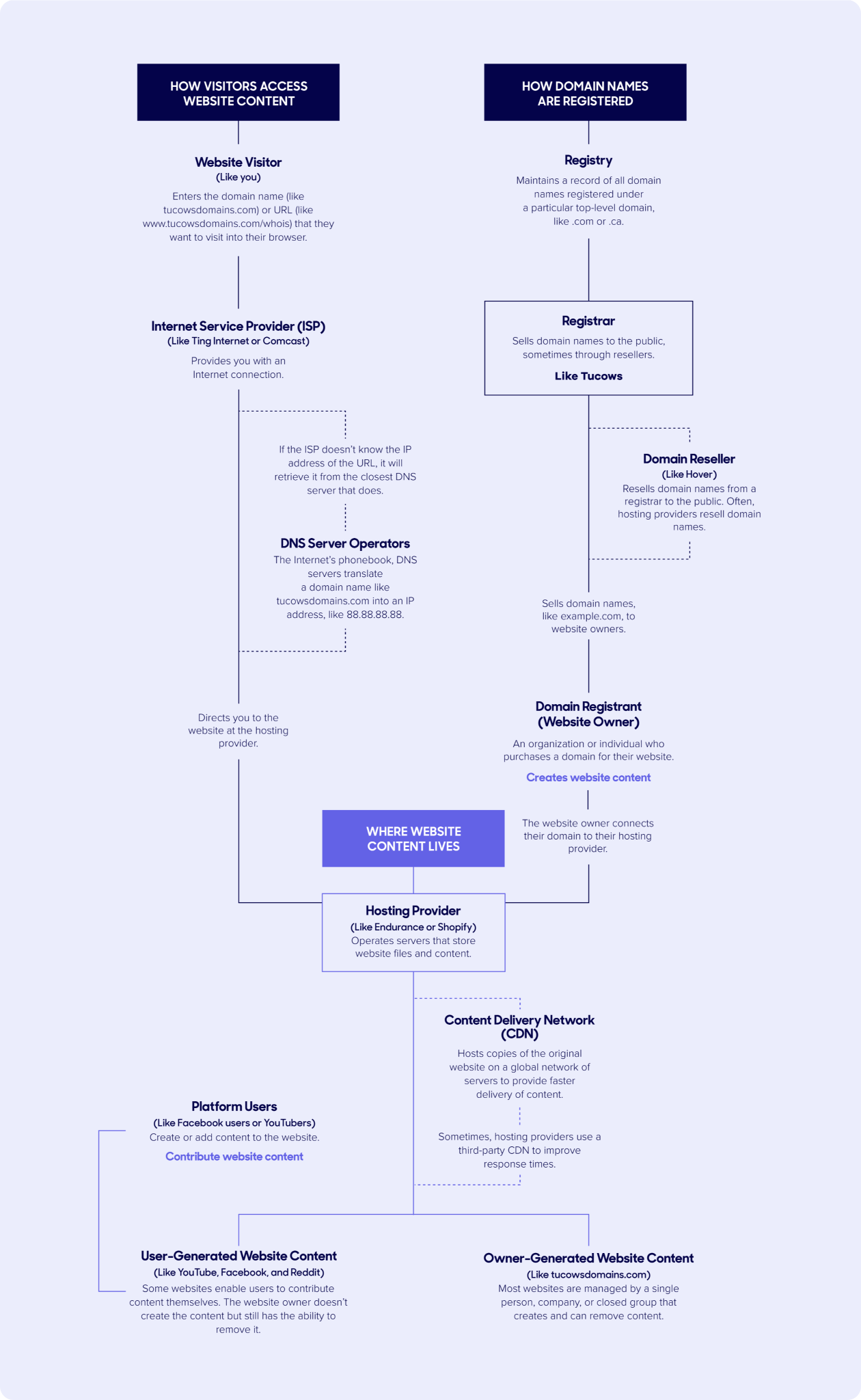 To understand how website content is accessed, you must understand what domain names are and how they work. Domain names are a fundamental part of Internet infrastructure that enable us to easily access websites, email servers, and other content. Without domain names, to access a website, you’d have to memorize the IP address where it lives (can you imagine?). With domain names, you just get to type in a memorable string of characters (much easier).